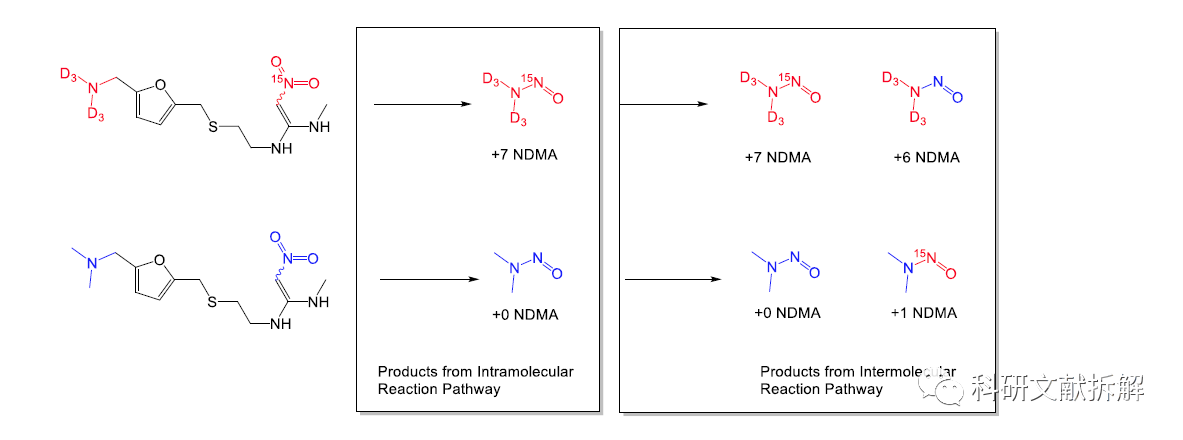 因此雷尼替丁中的NDMA產生途徑是:藥物結構中的硝基和二甲胺反應產生,至于反應機理,作者說還沒有研究明白。